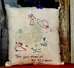 A lovley pillow with summer flower, bird houses and bird feeders.